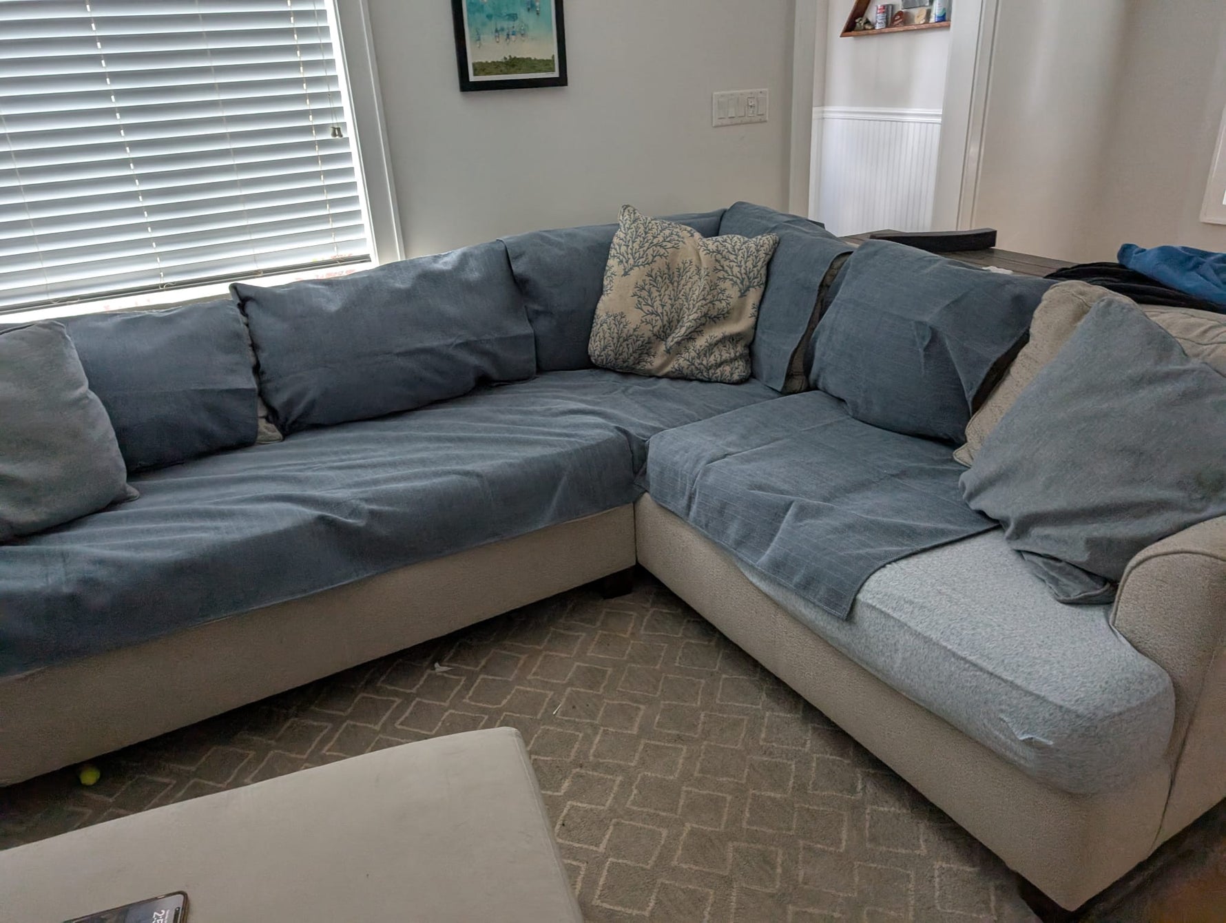 The chenille fabric hides fur and small scratches, and it doesn’t slip off easily.