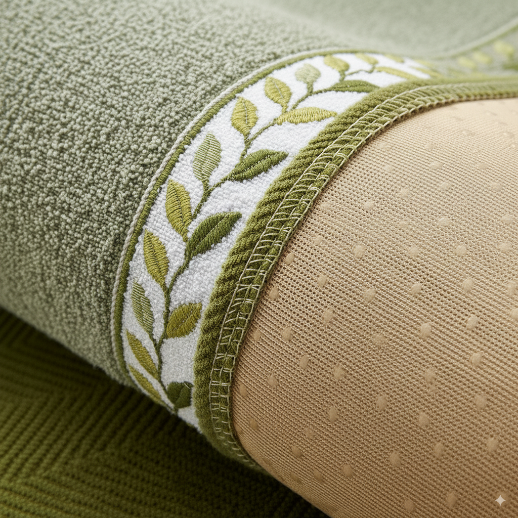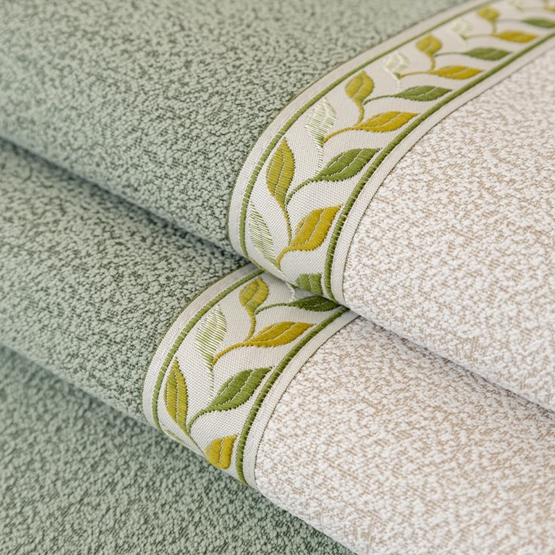 The OliveGrace collection features a chic color-block style paired with delicate leaf-pattern trims, bringing a modern yet cozy feel to any space.