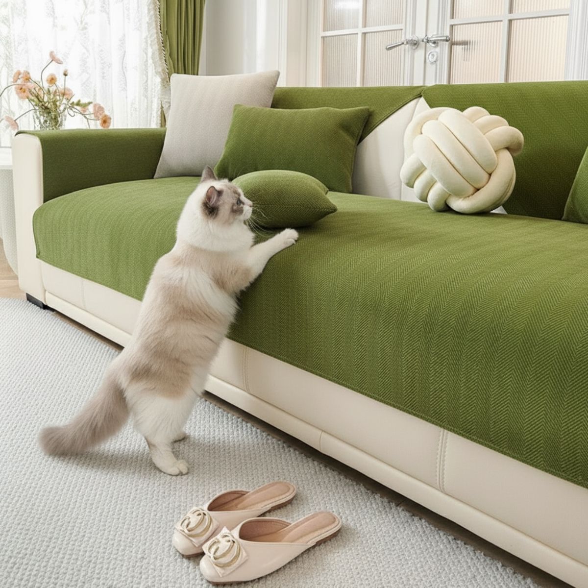 Designed for homes with pets — because love sometimes has paws. The chenille weave is tightly constructed to resist picking and snagging, while the herringbone texture helps disguise minor claw marks. Fur doesn’t cling easily and can be brushed or vacuumed off in seconds. So yes, it’s safe, durable, and gentle for both you and your furry friends.
